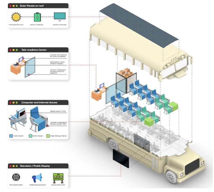 By repurposing a type C Bus to a fully self-sustaining mobile telemedicine, digital café/library and information center. Creating social inclusivity, bridging the digital divides and fostering partnership through an internet, digital and Virtual Reality concept of information and SDGs advocacy delivery in both cities and remote rural villages all over the world.